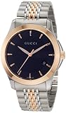 Une combinaison masculin de l'argent et chaleureux tons de rose, la femme Gucci G-Timeless acier et PVD rose Cadran Noir offre un design très contemporain avec une touche indéniable. Sa présentation commence avec un 38mm rose PVD boîtier en acier inoxydable et lunette. Ces éléments de couleur rose entoure un cadran noir texturé gras marqueurs offrant des index et aiguilles lumineuses alimentées par le légendaire mouvement à quartz suisse. Le cadran, qui est protégé par un verre saphir inrayable, comporte également l'emblématique "G" logo et une fenêtre affichage de la date à la position 4 'o clock. Un bracelet en acier inoxydable belle accentués avec une ligne centrale de rose PVD donne cette montre sa touche finale qui glisse autour du poignet pour tenir dans une élégante boucle déployante. Ornez votre poignet avec une montre à partir d'une marque qui incarne l'artisanat de qualité supérieure et de raffinement-go Gucci.